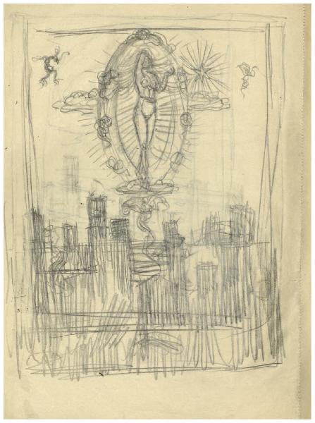 - NOTIZIE STORICO CRITICHE A differenza di altri taccuini dell'artista conservati presso il Fondo Disertori al Gabinetto dei Disegni del Castello, più coerenti per epoca di composizione, questo quaderno sembra aver accompagnato l'artista in diversi viaggi: è forse in tale prospettiva che deve leggersi una nota manoscritta presente sulla carta 39 "[...]/ 15 Venezia/ 14 Monaco/ 13 Firenze/ 12 Venezia/ 11 Gubbio".\nPer questa ragione fatica a trovare spiegazione, in tale contesto, un disegno che sembrerebbe afferiree alla genesi dell'acquaforte Il Pianeta Venere (Bellini-Alberti 45). \nL'incisione è datata in lastra 1924 e in quell'anno fu esposta alla Biennale di Venezia. Le diverse fasi di elaborazione sono attestate da almeno un'ottantina di fogli nel Fondo Disertori del Gabinetto dei Disegni del Castello Sforzesco. Se si presta fede a quanto riferito dall'artista in un profilo autobiografico pubblicato da Riccardo Maroni nel 1954 (p. 28) la prima idea per una serie dedicata ai sette pianeti, a partire da Venere, risalirebbe al periodo in cui si trovava a Firenze (dove si era trasferito nel 1923). Questa cronologia sembrerebbe confermata da una nota manoscritta, "Firenze 1923" presente su almeno tre disegni, oggi conservati al Mart (inv. 2117, 2780, 2779; cat. Bellini-Alberti, fig. 45/a, 45/c e 45/d a p. 61). Non si spiega pertanto la data MDMXXI presente su inv. FD D 453. Difficile dire se tutti i disegni di nudo femminile che si propone qui di leggere in relazione con la preparazione dell'acquaforte risalgano proprio a questo momento, oppure se alcuni fossero precedenti. La veduta in basso è ispirata a San Gimignano, animata da una quantità di macchine belliche in molti casi ispirate al De re militari di Valturio. Nel cielo, entro una mandorla di luce Venere è assisa con in mano lo scettro, circondata dai segni zodiacali del Toro (sua casa principale), della Bilancia (casa secondaria) e infine di Cupido, che Disertori ha tratto da un bulino di Cristofano Robetta.