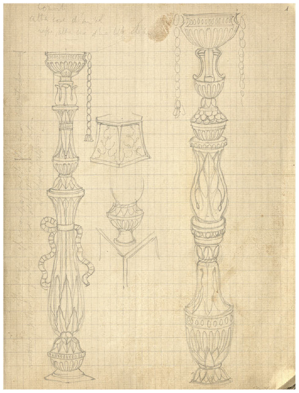 - NOTIZIE STORICO CRITICHE Questo foglio fa parte di un quaderno dell'artista che, per i temi trattati, in relazione certa con l'incisione Il Pianeta Giove (Bellini-Alberti 44) o con illustrazioni apparse sulle copertine della rivista Emporium tra il 1925 e il 1926, è databile con buon margine di sicurezza a ridosso di tale momento, tra il 1924 e il 1926, dopo la realizzazione del Pianeta Venere. Contiene, tra l'altro, diversi studi di cavallo senza testa, che si propone di inquadrare nell'ambito dello studio per il segno zodiacale del Sagittario che si vede appunto nel Pianeta Giove.\nQui in particolare Disertori ha studiato la base dell'acquasantiera che ha fregiato la copertina di Emporium del mese di novembre del 1925.