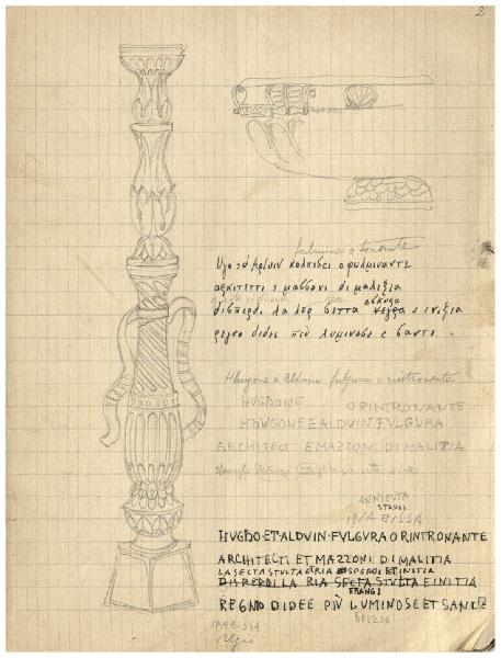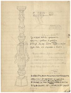 - NOTIZIE STORICO CRITICHE Questo foglio fa parte di un quaderno dell'artista che, per i temi trattati, in relazione certa con l'incisione Il Pianeta Giove (Bellini-Alberti 44) o con illustrazioni apparse sulle copertine della rivista Emporium tra il 1925 e il 1926, è databile con buon margine di sicurezza a ridosso di tale momento, tra il 1924 e il 1926, dopo la realizzazione del Pianeta Venere. Contiene, tra l'altro, diversi studi di cavallo senza testa, che si propone di inquadrare nell'ambito dello studio per il segno zodiacale del Sagittario che si vede appunto nel Pianeta Giove.\nQui in particolare Disertori ha studiato la base e la vasca dell'acquasantiera apparsa sulla copertina di Emporium del mese di novembre del 1925.\nNella parte destra del foglio sono presenti versioni diverse (la prima in greco, le altre in volgare antico) di un'iscrizione che contiene l'invocazione al Pianeta Giove a fulminare tali Hugo e Alduin, architetti. L'epigrafe era destinata a illustrare il margine inferiore dell'acquaforte Il Pianeta Giove, come si vede nel catalogo Bellini-Alberti (44), che riferisce di un quarto stato con tale scritta (è possibile però che questa iscrizione fosse in realtà apposta a penna su un esemplare della collezione Andrea Disertori; andrà perciò verificata la condizione della matrice, ora conservata Mart, inv. MART 4260).