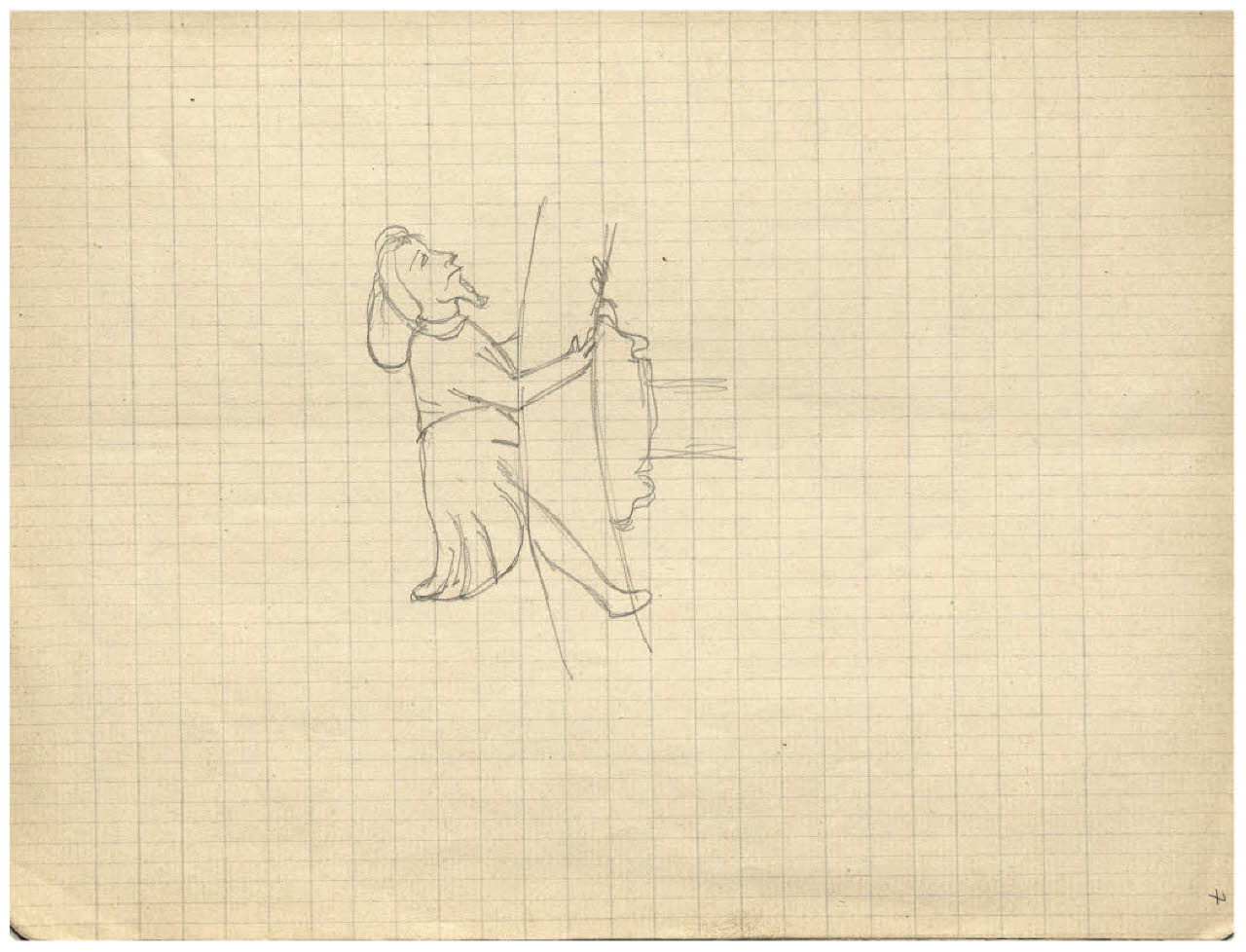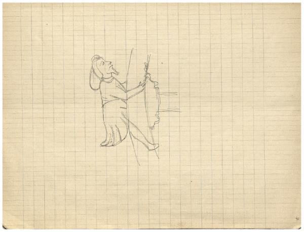 - NOTIZIE STORICO CRITICHE Questo foglio fa parte di un quaderno dell'artista che, per i temi trattati, in relazione certa con l'incisione Il Pianeta Giove (Bellini-Alberti 44) o con illustrazioni apparse sulle copertine della rivista Emporium tra il 1925 e il 1926, è databile con buon margine di sicurezza a ridosso di tale momento, tra il 1924 e il 1926, dopo la realizzazione del Pianeta Venere. Contiene, tra l'altro, diversi studi di cavallo senza testa, che si propone di inquadrare nell'ambito dello studio per il segno zodiacale del Sagittario che si vede appunto nel Pianeta Giove.\nIn questa pagina Disertori registra lo studio di una delle quattro figure che sono aggrappate alla Ruota della Fortuna sulla copertina del numero di luglio del 1926 di Emporium. Si distingue dagli studi per la ruota nell'acquaforte Apollo e la Fortuna (Bellini-Alberti 46) perchè in quel caso si tratta di figure femminili.