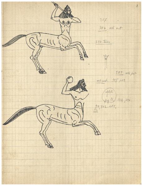 - NOTIZIE STORICO CRITICHE Questo foglio fa parte di un quaderno dell'artista che, per i temi trattati, in relazione certa con l'incisione Il Pianeta Giove (Bellini-Alberti 44) o con illustrazioni apparse sulle copertine della rivista Emporium tra il 1925 e il 1926, è databile con buon margine di sicurezza a ridosso di tale momento, tra il 1924 e il 1926, dopo la realizzazione del Pianeta Venere. Contiene, tra l'altro, diversi studi di cavallo senza testa, che si propone di inquadrare nell'ambito dello studio per il segno zodiacale del Sagittario che si vede appunto nel Pianeta Giove.\nIn questa pagina Disertori propone due varianti sul tema del centauro, possibilmente da leggere (come le iscrizioni riportate alla c. 2 del quadernetto) in riferimento alla genesi del Pianeta Giove (Bellini-Alberti 44), dove ai piedi della divinità scatta proprio la figura di un centauro come personificazione del segno zodiacale del Sagittario. Nella prospettiva di una ricerca destinata al progetto iconografico della tavola di Giove si propone di vedere anche gli studi per il corpo di un cavallo alle pagine che seguono.