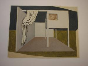 All'interno di una scatola prospettica priva di una parete laterale e del soffitto, è presente un parallelepipedo sorretto da piloni e un panneggio. Elementi scenografici che non proiettano nessuna ombra sul fondale spoglio e misterioso.