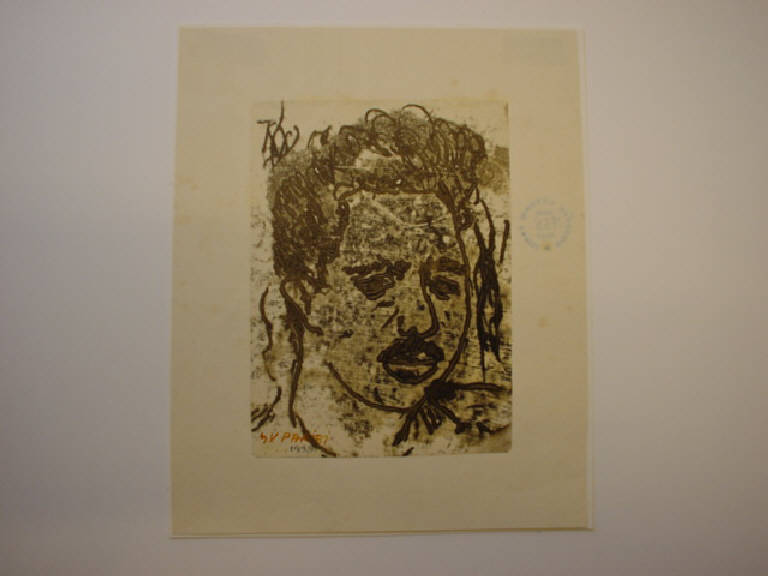 Con tratti chiari, marcati e decisi, che risaltano sul fondo trattato a olio grigio scuro, è raffigurato il giovane artista in posizione quasi frontale. Totale monocromia.
