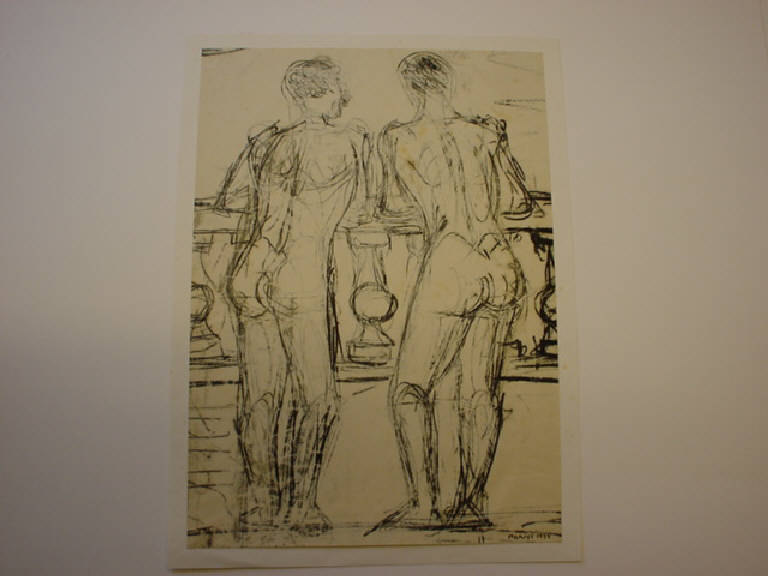 Rappresentazione frontale di due figure intere maschili, viste di spalle. Le figure sono ignude e appoggiate ad una balaustra. Il segno è tormentato ed impreciso nell'evidenziare la tornitura dei muscoli e i finimenti strutturali della balaustra.
