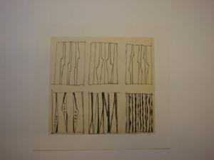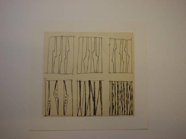 Sei moduli quadrati, tracciati ad inchiostro nero, sono disposti in tre colonne simmetriche, a gruppi di due. Al loro interno sono disposte sagome poligonali allungate, di diverso spessore ed in diversa disposizione.