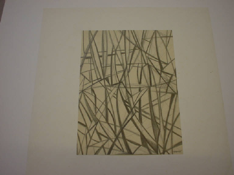 L'intero piano rettangolare del foglio è stato campito con linee curve, ad andamento paraboloide, e con linee diagonali che si intersecano formando un reticolato complesso ed irregolare per morfologia e rapporti proporzionali.