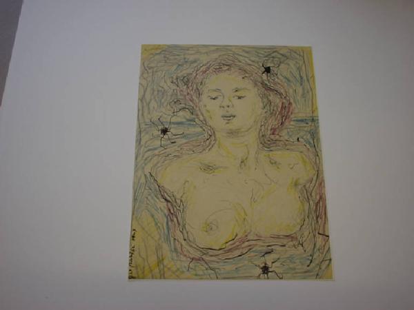Il disegno raffigura un busto di donna a petto scoperto emergente dall'acqua; il paesaggio marino è sintetizzato nelle linee azzurre e nelle stelle marine - stilizzate - sparse intorno alla figura. L'immagine è resa con tratto sottilissimo e rapido.