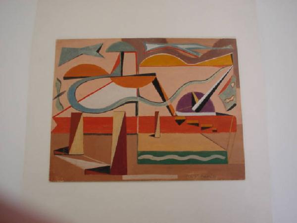 Su di uno sfondo piatto rosa sono disposti liberamente degli elementi volumetrici (una piattaforma, un muretto, delle meridiane) e delle sagome curvilinee (tra cui quattro semicerchi) di carattere fantastico, non riconoscibili.