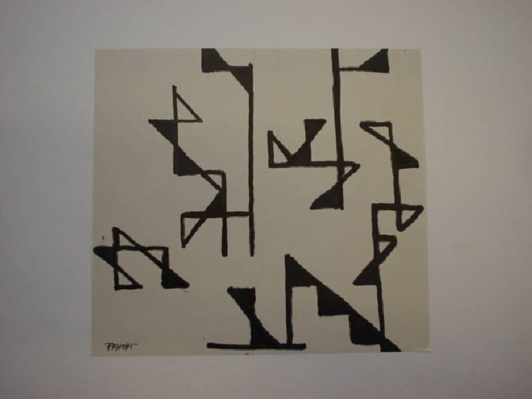 Composizione formata dal libero accostamento di moduli generati a partire da una figura triangolare semplice, contornata o campita di colore.
