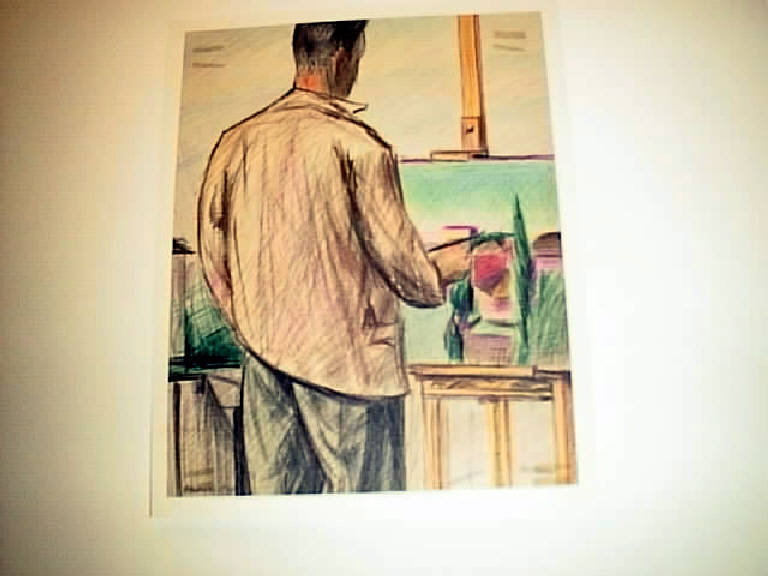 Una figura maschile di spalle è rappresentata in piedi, in atto di dipingere, di fronte ad un quadro posato sul cavalletto. La definizione volumetrica interessa solo il soggetto principale del disegno.
