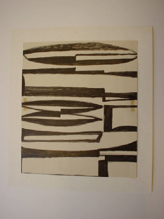Su un piano a sviluppo verticale si inscrivono forme pseudo geometriche. I tratti di un nero intenso sul fondo bianco avorio creano effetti di totale monocromia.
