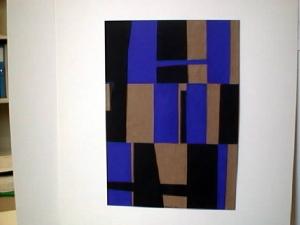 Sono presenti ritagli rettangolari e trapezoiali di colore blu e nero su cartoncino grezzo di colore beige