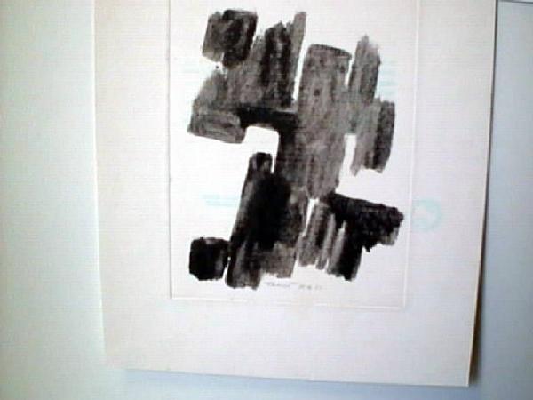 Larghe campiture di colore nero steso a velature formano una figura di segno astratto