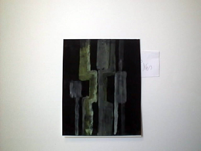 Su fondo nero sono stese pennellate Ad andamento geometrico in pervalenza verticali di colore grigio e verde