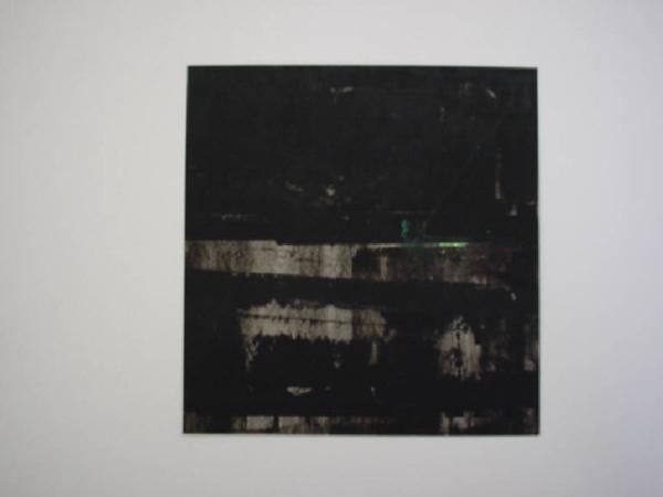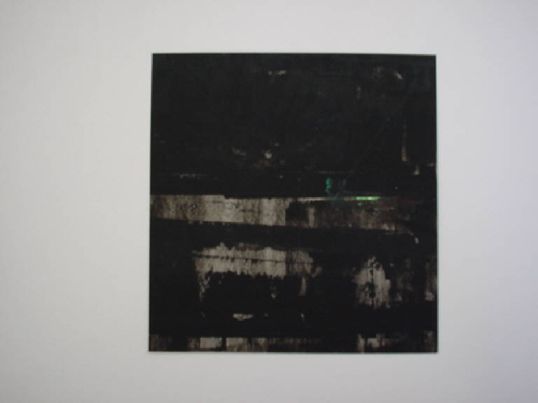 Il colore nero è distribuito su tutto il piano con larghe pennellate verticali creando una texture di per sé esteticamente autonoma - lo spazio non intaccato dal colore presenta tracce di tempera grigia e verde