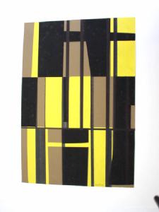 Campiture rettangolari allungate in verticale di diverso colore (nero, beige, giallo) sono accostate fra loro, e interrotte da rare linee orizzontali di colore scuro.