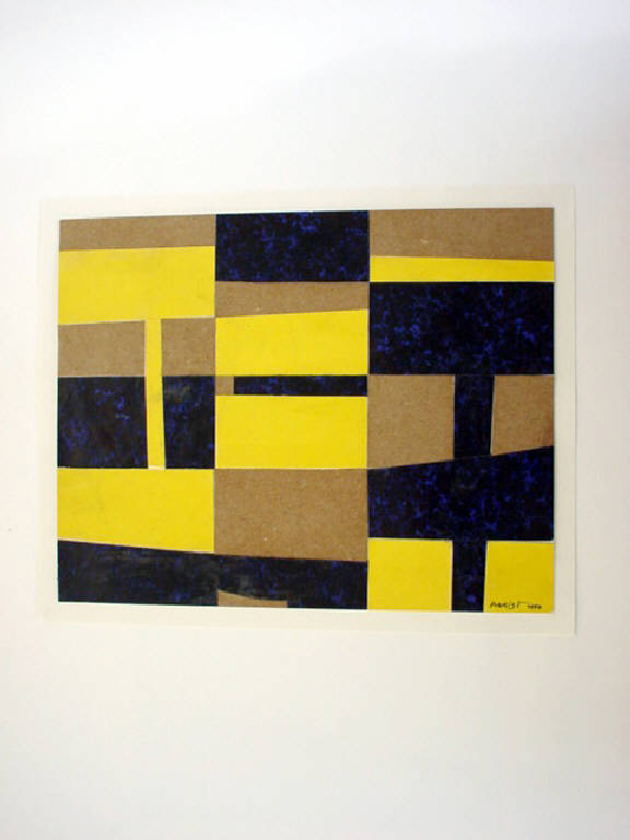 Come tasselli di mosaico, l'autore dispone ritagli di carta colorata dando forma ad una scacchiera quasi regolare - i ritagli hanno tutti forma rettangolare o trapezoidale - e armoniosa dal punto di vista cromatico (i colori della carte usate sono il beige, il nero e il blu)