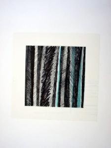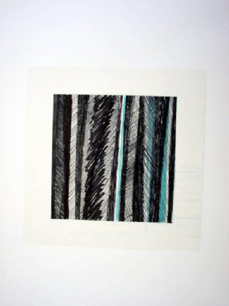 Il piano di fondo è interamente campito da sottili moduli verticali, di diverso spessore, trattati ad inchiostro nero e grigio (di diversa intensità) steso a tratteggio obliquo. Tra alcuni di questi moduli risaltano segni di pennarello celeste.