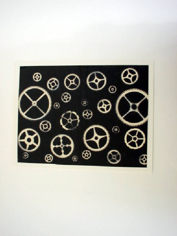 Raffigura forme circolari che, pur ispirate evidentemente ad ingranaggi meccanici, danno la suggestione di forme stellari. Tali forme bianco avorio o appena sfumate in grigio contrastano con il fondo campito da nero assoluto.