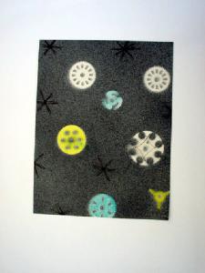 - NOTIZIE STORICO CRITICHE Si inserisce tra le esperienze grafiche dell¿artista condotte con tecniche varie, nuove e in anticipo cronologicamente rispetto alla diffusione di queste stesse tecniche. Nel caso in esame si inserisce nella serie delle aerografie. Su di un piano interamente campito in grigio si inscrivono moduli circolari e stellari colorati di bianco, azzurro, nero e giallo che evocano forme stellari luminose.