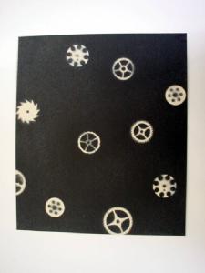 Su di un piano di fondo grigio si inscrivono forme circolari (che rievocano ingranaggi meccanici) e stellari colorate prevalentemente di bianco