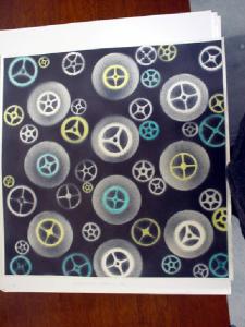 Su di un piano di fondo nero (in alcuni punti sfumato in grigio) si inscrivono forme circolari e stellari in bianco, giallo ed azzurro avvolte talvolta da un alone circolare di pulviscolo luminoso.