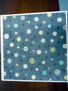 Sul piano di fondo interamente campito di nero assoluto si inscrivono forme circolari e stellari bianche che sembrano irradiare sul fondo un pulviscolo luminoso.