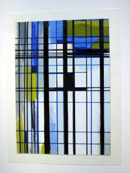 Linee orizzontali e verticali , di colore nero e blu, formano una griglia irregolare, entro le cui maglie sono disposte campiture di blu, verde, celeste e grigio. Di maggiore e diverso spessore si presentano, in dissimmetria, quattro verticali