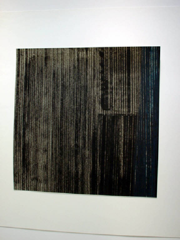 Il piano è completamente invaso da verticali fitte, in sequenza, realizzate con l'uso del pennello giappponese e della lamina metallica. Sulla destra, in alto, è percettivamente visibile una sequenza di verticali leggermente oblique e più corte