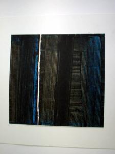 Entro il piano occupato da una fitta sequenza di righe sottili verticali e orizzontali - in dissimmetria sono poi tracciate - in negativo, ovvero levando il colore con la lamina - due verticali irregolari
