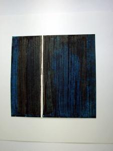Entro il piano occupato da una fitta sequenza di righe verticali o leggermente oblique sottili, in dissimmetria è poi tracciata - in negativo, ovvero levando il colore con la lamina - una verticale di maggiore spessore.