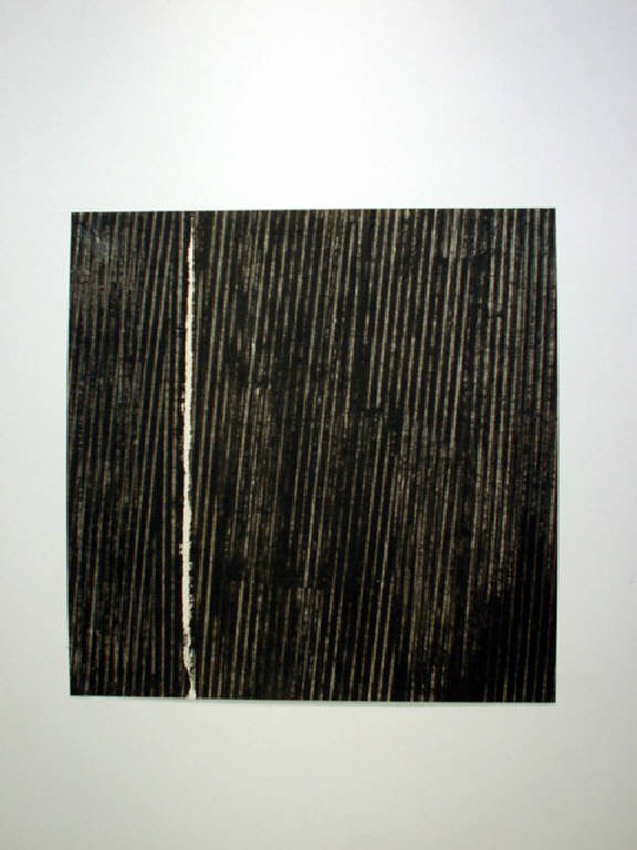 Il piano è completamente invaso da verticali fitte, in sequenza, realizzate con l'uso del pennello giappponese e della lamina metallica. Sulla destra, in alto, è percettivamente visibile una sequenza di verticali leggermente oblique e più corte