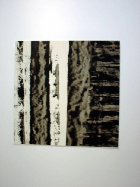 Il piano è completamente invaso da verticali fitte, in sequenza, realizzate con l'uso del pennello giappponese e della lamina metallica. Sulla destra, in alto, è percettivamente visibile una sequenza di verticali leggermente oblique e più corte