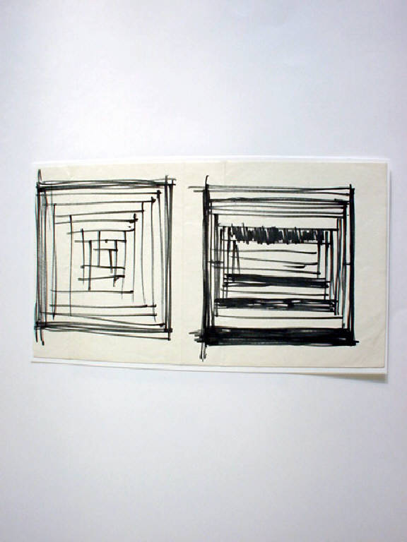 Si tratta di due studi per tridimensioni, realizzati con pennarello nero su carta avorio. Entro due quadrati sono tracciate linee orizzontali e verticali in ritmo decrescente.