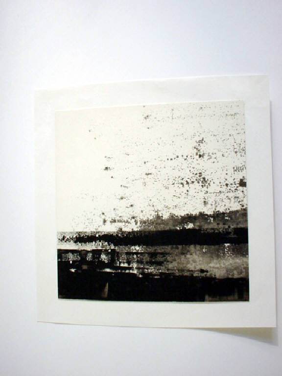 Il piano è occupato da una rada sequenza di campiture di colore nero molto diluito stese con la spatola, e dunque dal contorno volutamnte slabbrato