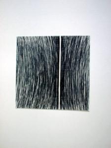 Da un sottile modulo verticale (una striscia del fondo), posto in dissimmetria dinamica rispetto allo spazio globale, si dipartono in un fittissimo accostamento linee paraboloidi in colore grigio che lasciano emergere a tratti il fondo bianco.
