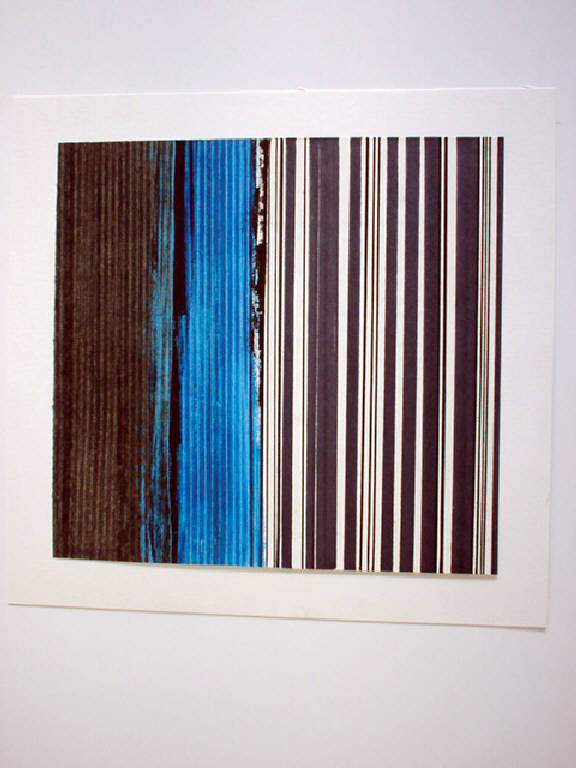 Il piano è occupato sulla sinistra da una fitta sequenza di righe verticali regolari di colore marrone; sulla sinistra con lo stesso colore sono stesa con la spatola campiture verticali dai contorni irregolari. In dissimmetria tra queste due zonature risalta una fascia di colore azzurro.