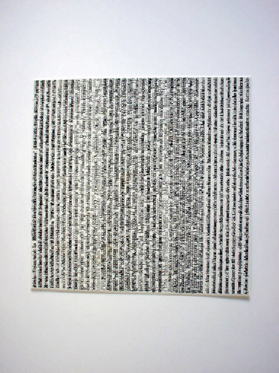 L'autore applica le potenzialità e le espressività dei segni verticali anche ad "altro" rispetto alla sua produzione. In questo caso ha capovolto a 90° rispetto al senso di lettura un testo, e ne ha sovrapposto un altro avente lo stesso orientamento.