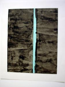 Sul fondo dall'effetto increspato dato dalla matericità dell'applicazione del colore si staglia una fascia di colore azzurro in verticale, in dissimmetria