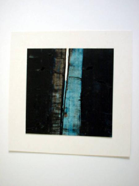 Sul fondo dall'effetto increspato dato dalla matericità dell'applicazione del colore si staglia una fascia di colore azzurro in verticale, in dissimmetria