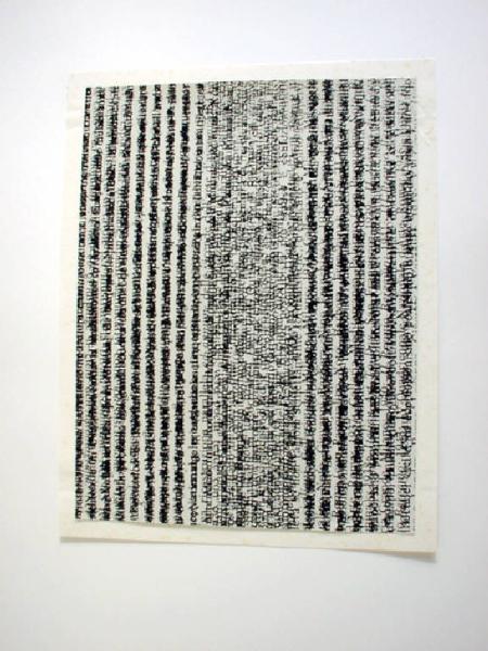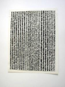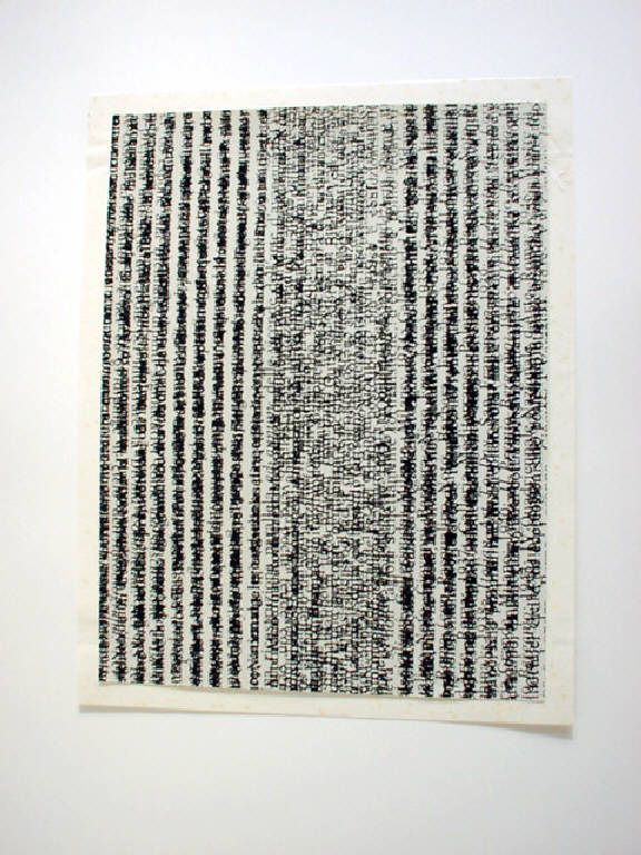 L'autore applica le potenzialità e le espressività dei segni verticali anche ad "altro" rispetto alla sua produzione. In questo caso ha capovolto a 90° rispetto al senso di lettura un testo (di critica d'arte), e ne ha sovrapposto un altro avente lo stesso senso.