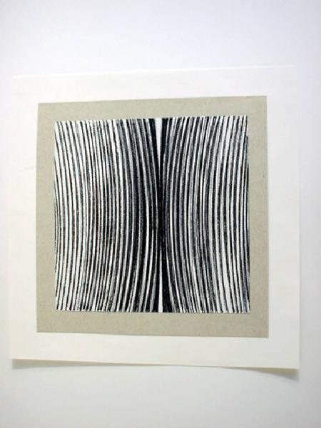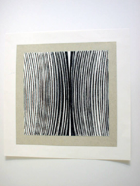 Due serie di linee paraboloidi in grigio e nero si dipartono da una striscia verticale in dissimmetria dinamica rispetto allo spazio globale, in fitto accostamento che va diradandosi man mano che si procede verso i due lati, e che lascia emergere il fondo