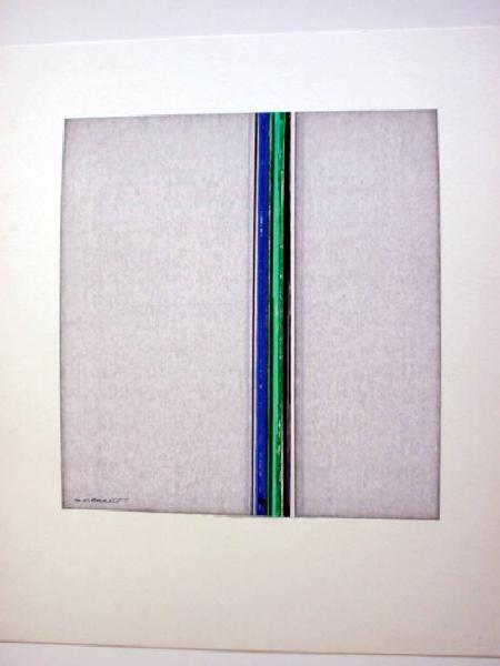 Entro un'area quadrangolare, al centro e leggermente spostate a destra, sono tracciate a tutta altezza linee parallele di diverso spessore e tonalità - blu e verde e nero - nel rispetto della dissimmetria dinamica.