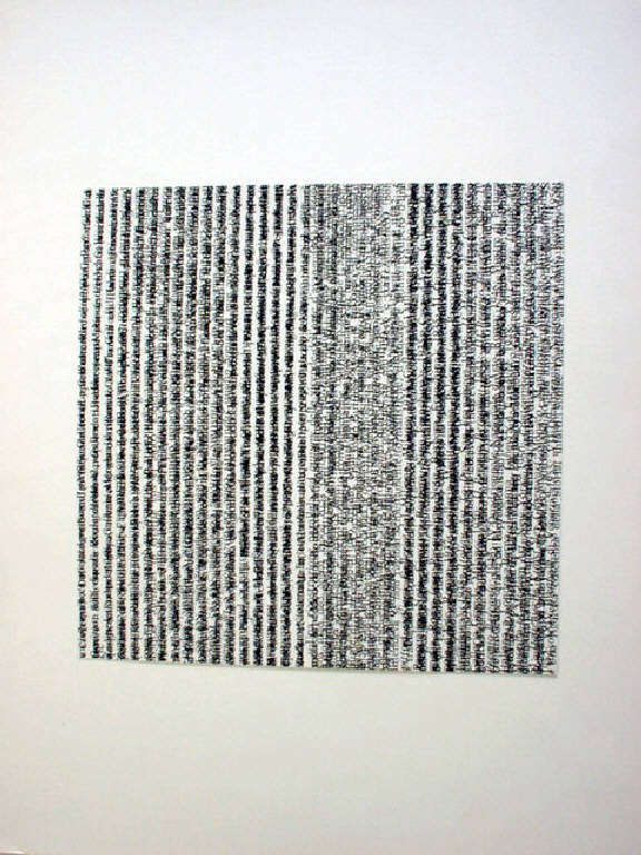 L'autore applica le potenzialità e le espressività dei segni verticali anche ad "altro" rispetto alla sua produzione. In questo caso ha capovolto a 90° rispetto al senso di lettura un testo (di critica d'arte), e ne ha sovrapposto un altro avente lo stesso senso