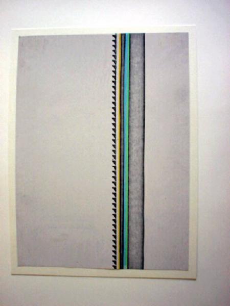 Entro un'area rettangolare, al centro e leggermente spostate a destra, sono tracciate a tutta altezza linee parallele di diverso spessore e tonalità - una delle quali a bordo dentellato- nel rispetto della dissimmetria dinamica.