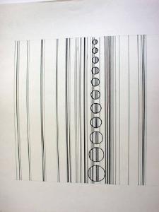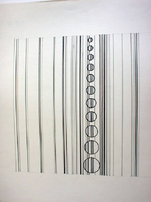 Sul piano di fondo bianco si inscrive ad intervalli regolari una serie di linee verticali nere di diversa intensità e spessore che convergono verso una successione verticale di moduli circolari decrescenti in grandezza verso l¿alto, posti in dissimmetria dinamica