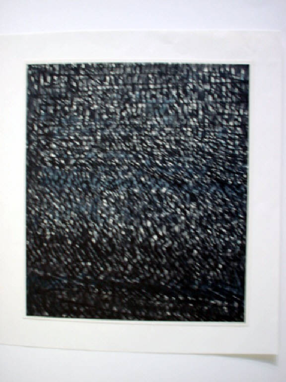 La tempera è usata anche in questo caso per la particolarità dei suoi effetti materici. In questo caso è stata realizzata una texture con i colori nero e blu