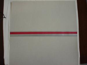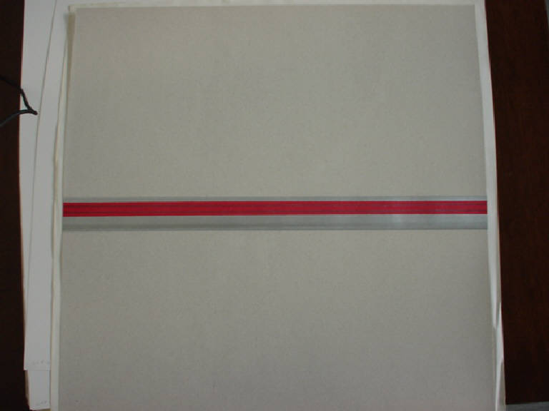 Su un campo grigio è disposta in dissimmetria dinamica una fascia sottile di verticali nere, rosse e grigie