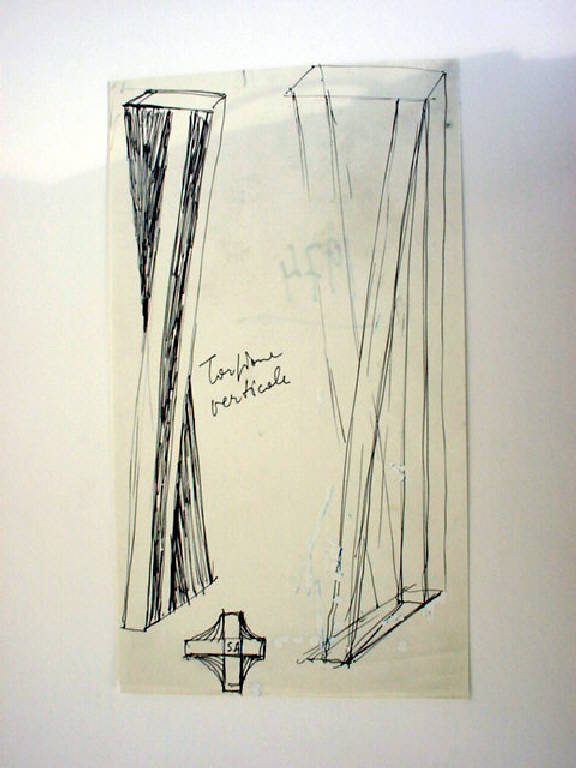 Studio per opere tridimensionali. Sono visibili due vedute prospettiche e una in pianta dello stesso progetto, consistente nella torsione di moduli verticali.