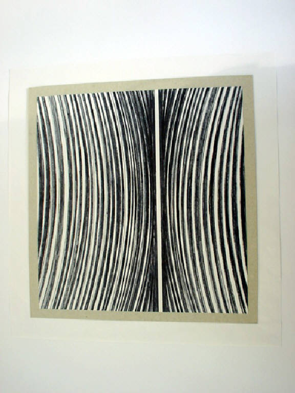 Da una linea bianca verticale si dipartono, a sinistra e a destra rispetto ad essa, una serie di linee parallele ad andamento paraboloide, a inchiostro nero e grigio scuro.